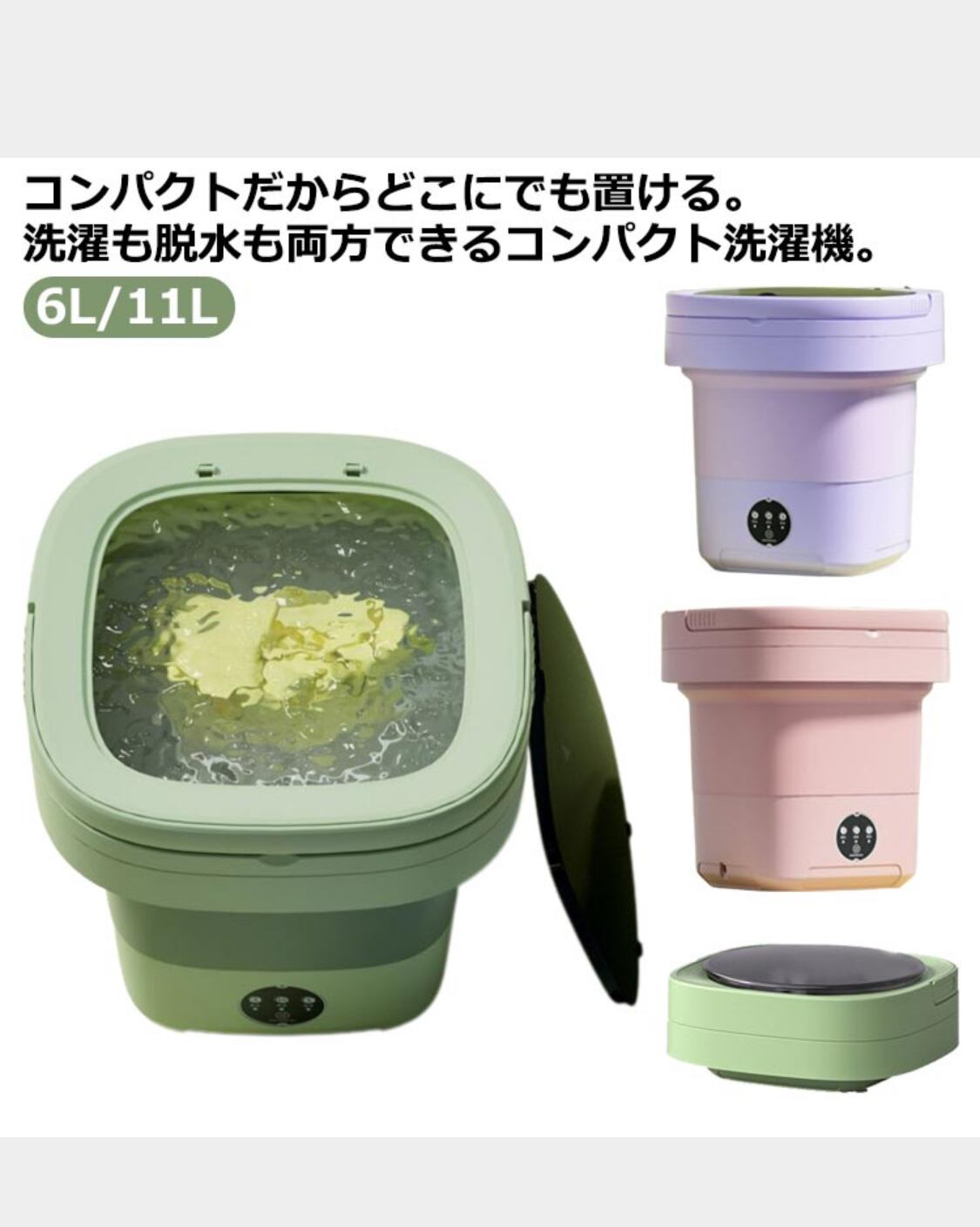 コンパクトだからどこにでも置ける。洗濯も脱水も両方できるコンパクト洗濯機。【6L/11L】【強力モーター】本商品は遠心力の力で洗浄/脱水を効率よく行います。コンパクトながら遠心力の力を最大限に 活用できる構造になっているため、使用時の音も60dBととても小さいにも関わらず汚れも しっかり落とします。【しっかり脱水】排水/脱水は付属のカゴをセットすることでより水切りの効率を上げることができるので とても便利です。【持ち運びがラクラク】いつでもどこでも持ち運べるので、マスクやシャツ、下着などを手軽に洗濯できます。【節電/節水】シャツや下着など軽い衣類を洗濯するのに最適です。 通常洗濯機の1/15の水で洗濯が可能で経済的です。【使用簡単】5分/10分洗濯・3分脱水のモードを選択して、スタートボダンを押せば起動させる。各設定はシンプルなボタンで行えるので、難しい操作も不要です。機械やタッチパネルなどが苦手な方も、すぐに使えます。
