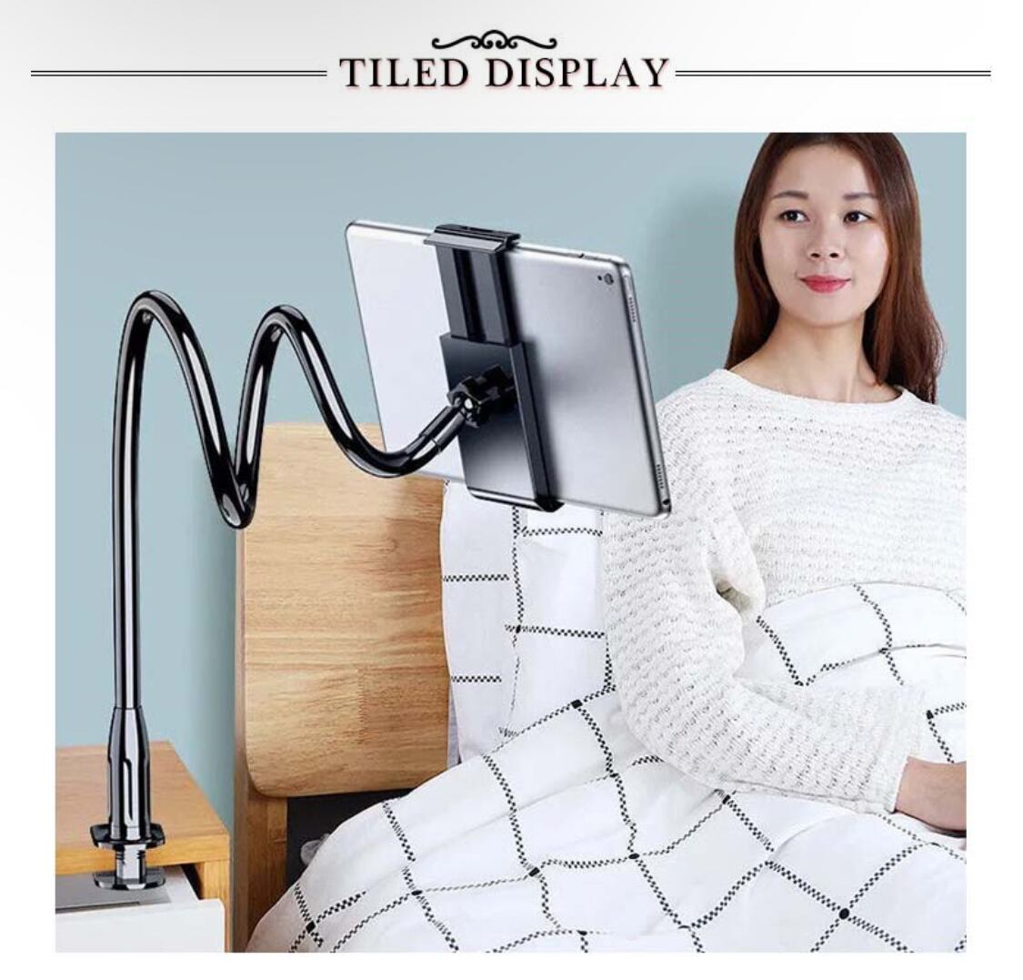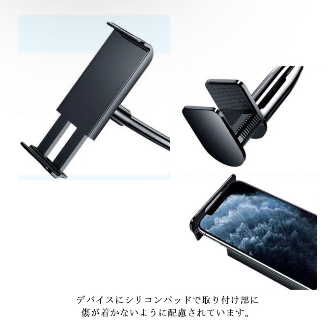 クランプ式タブレット/スマホ通用スタンド。土台に滑り止めパッドが付きで、破損から守ります。デバイスにシリコンパッドで取り付け部に傷が着かないように配慮されています。