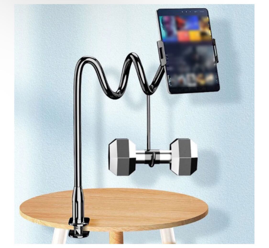 取り付けが簡単・360度回転可能。11インチまでのタブレットと全てのスマホに対応できる。テーブルや机など8cmまでの台座に取り付け可能。