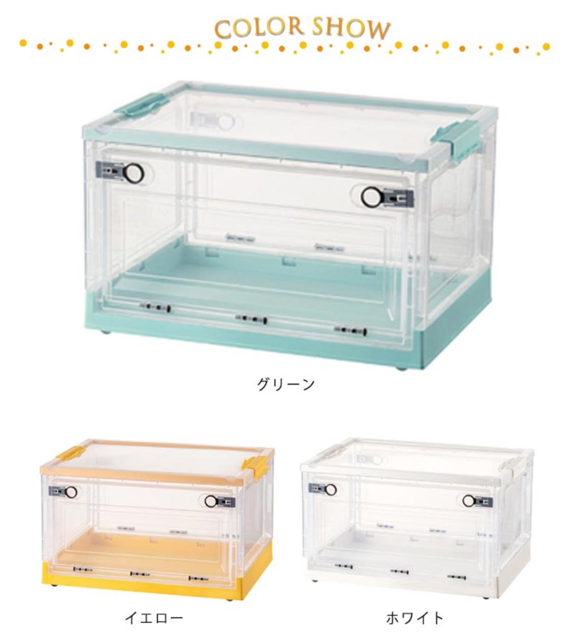 省スペースを活用できる折り畳み収納コンテナ。食品、衣料品、書類、おもちゃ、日用品などの収納に便利です。積み重ねもできる。側面が半透明で中身が見やすい。