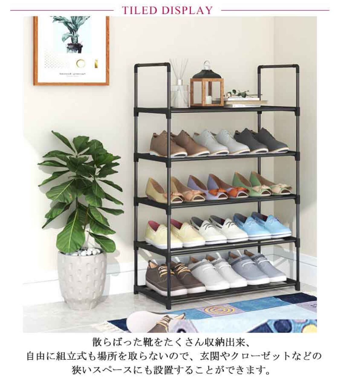 玄関に置いても邪魔にならない8段のシューズラック。散らばった靴をたくさん収納出来、自由に組立式も場所を取らないので、玄関やクローゼットなどの狭いスペースにも設置することができます。