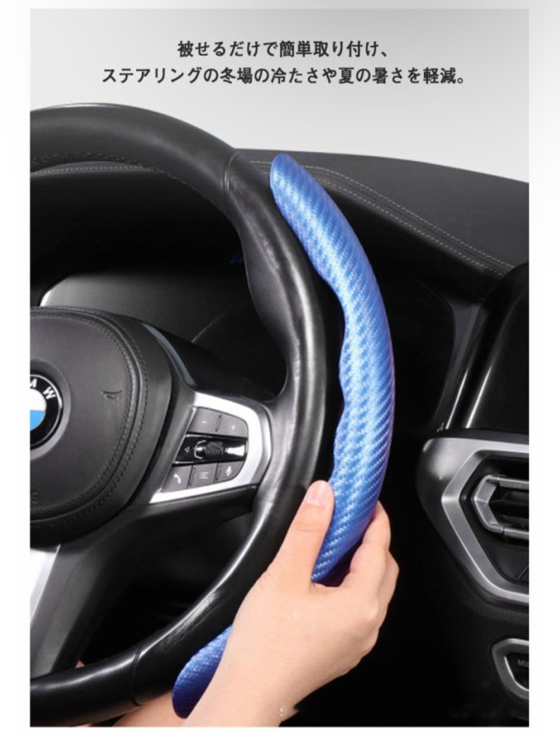 おしゃれなカーボン調デザイン、快適な握り心地、ズレ防止効果も◎被せるだけで簡単取り付け、ステアリングの冬場の冷たさや夏の暑さを軽減。