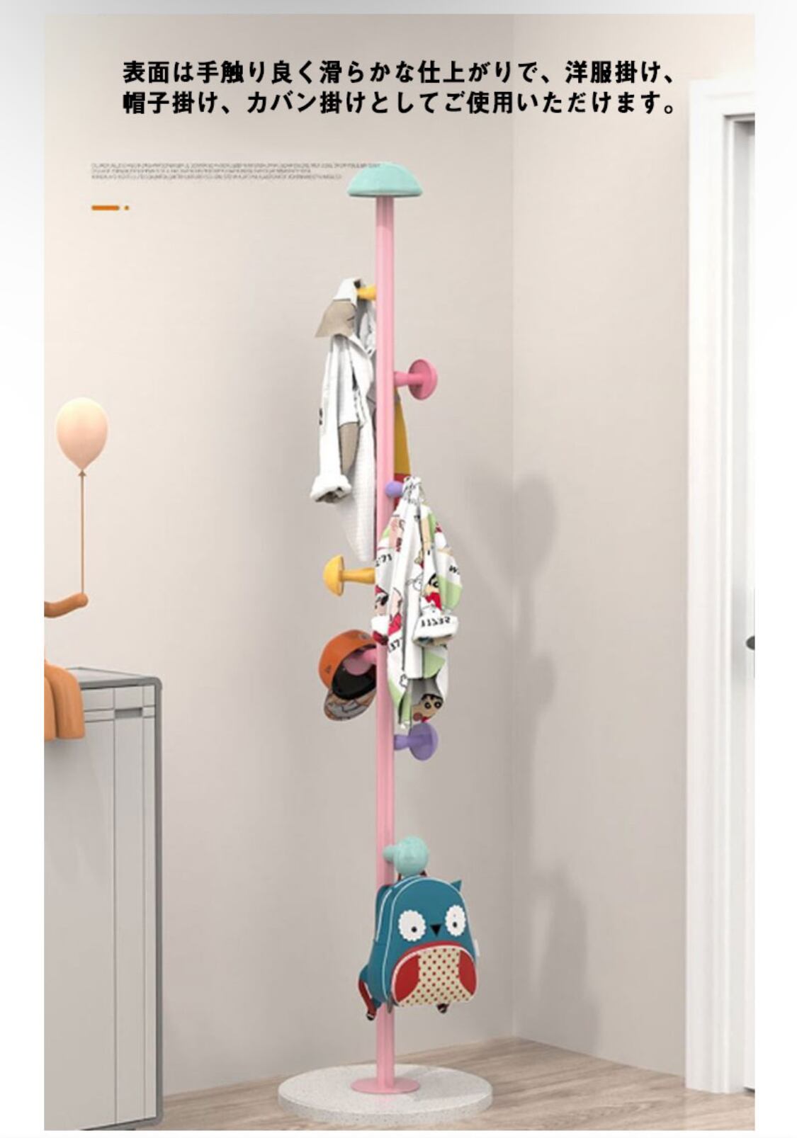 かわいいデザイン、省スペースなポールハンガー。表面は手触り良く滑らかな仕上がりで、洋服掛け、帽子掛け、カバン掛けとしてご使用いただけます。