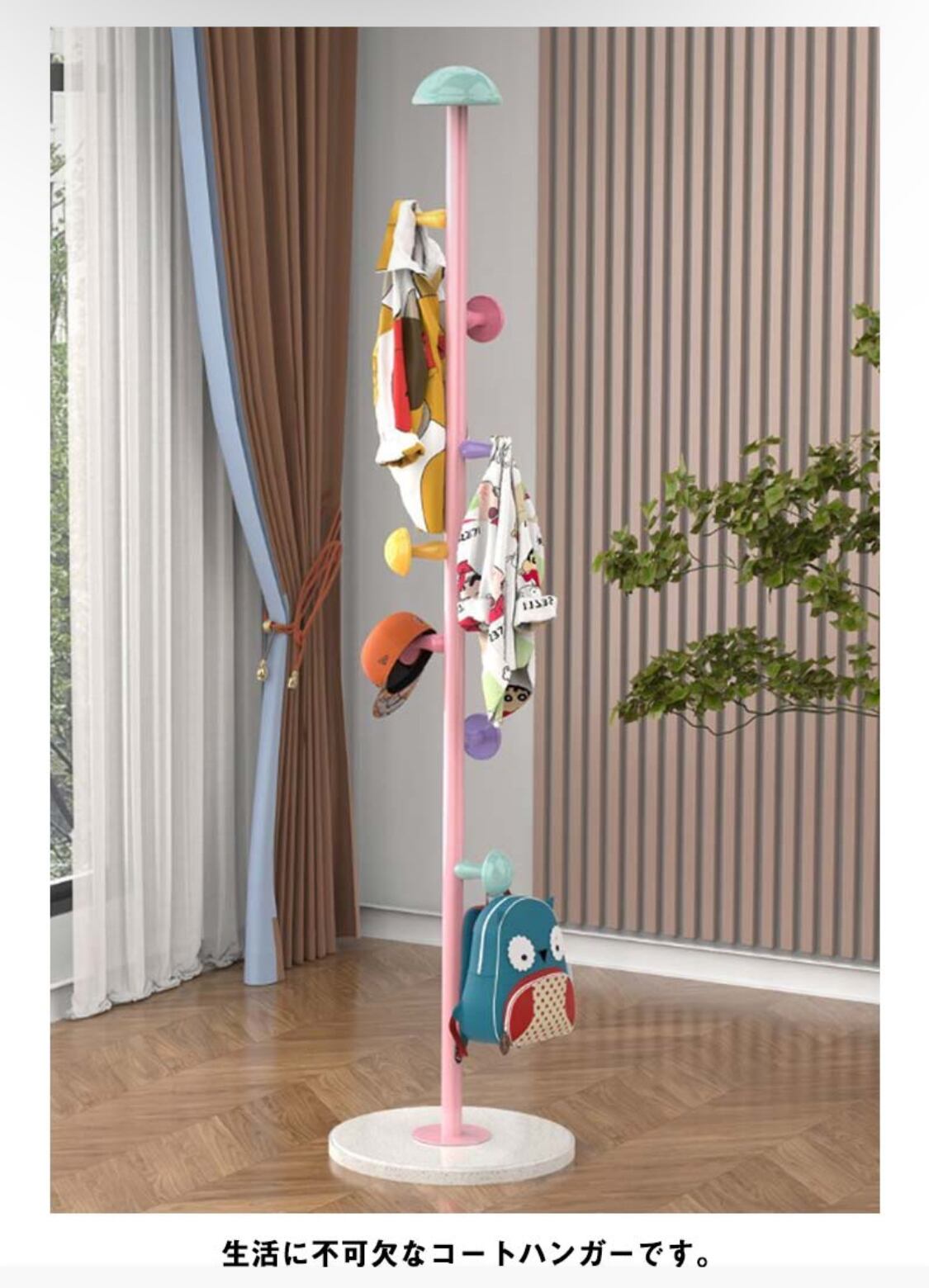 子供部屋、リビング、玄関など場所をとらないので、どこでも収納できます。安定感抜群の30cm丸底デザイン、荷物が入ったバッグや冬の厚いコートを掛けても倒れる心配がなく、しっかり安定してくれます。
