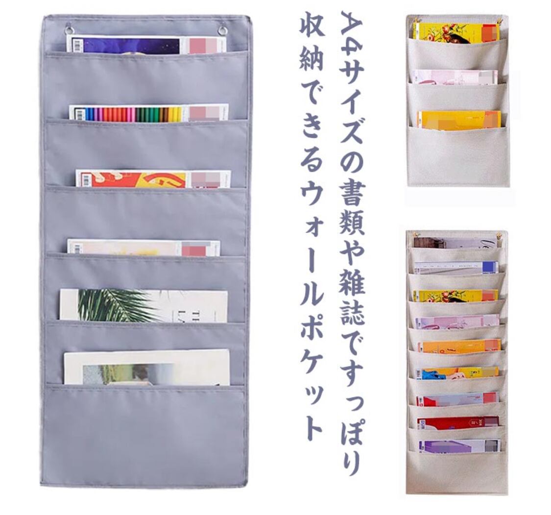 取り付け簡単、ドアにかける場合は上部の2つ穴に付属のフックを通し、ドアにかけるだけ!デスク周りの書類整理、雑誌、冊子などのA4サイズのものを収納はもちろん、工夫次第で洗面室のタオルや洗濯ネット、クローゼット内でネクタイやスカーフ、ファッション小物など様々な収納で大活躍。