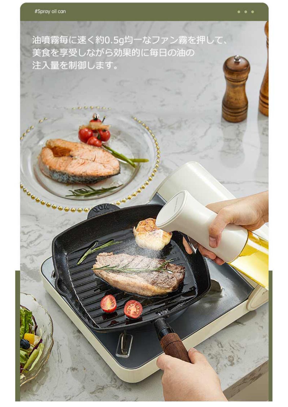 【油の出しすぎが防止!少量の使用で経済的! 新型スプレーボトル】細かい霧状になるので、油をムラなく吹き付けることが可能です。油噴霧毎に速く約0.5g均一なファン霧を押して、美食を享受しながら効果的に毎日の油の注入量を制御します。
