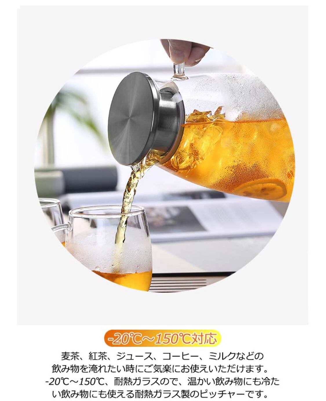 【-20℃~150℃対応】麦茶、紅茶、ジュース、コーヒー、ミルクなどの飲み物を淹れたい時にご気楽にお使えいただけます。-20℃~150℃、耐熱ガラスので、温かい飲み物にも冷たい飲み物にも使える耐熱ガラス製のピッチャーです。
