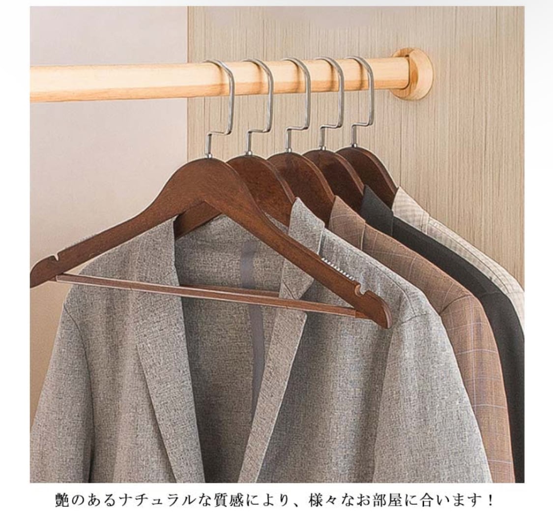 ハンガーの先に凹みがあるため、キャミワンピなどの肩紐が付いているお洋服も掛ける可能!艶のあるナチュラルな質感により、様々なお部屋に合います!