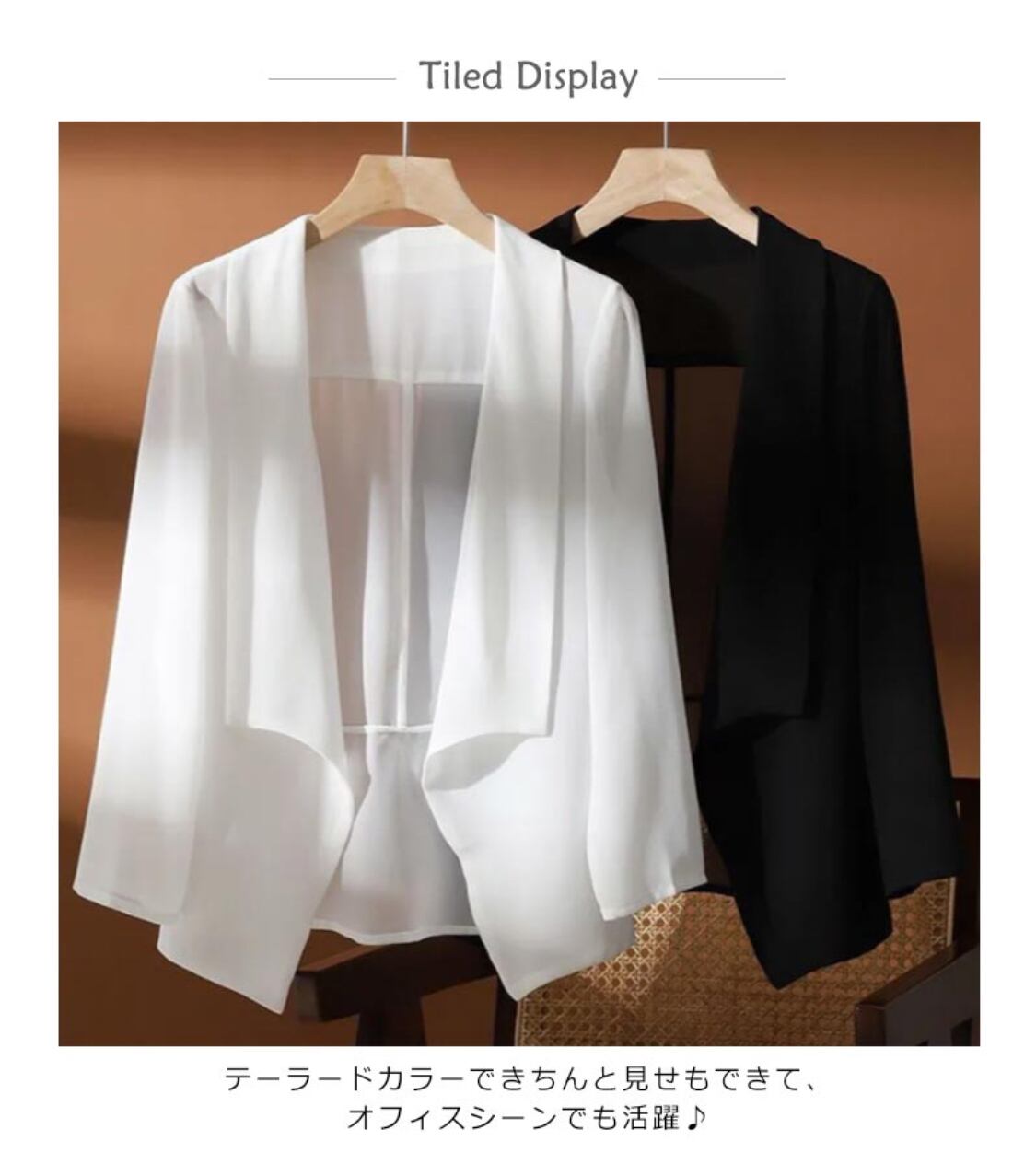 さらっと着こなせる薄手のシアージャケットが登場です。テーラードカラーできちんと見せもできて、オフィスシーンでも活躍♪またボタンがないデザインなので、さっと羽織れるのも便利です。