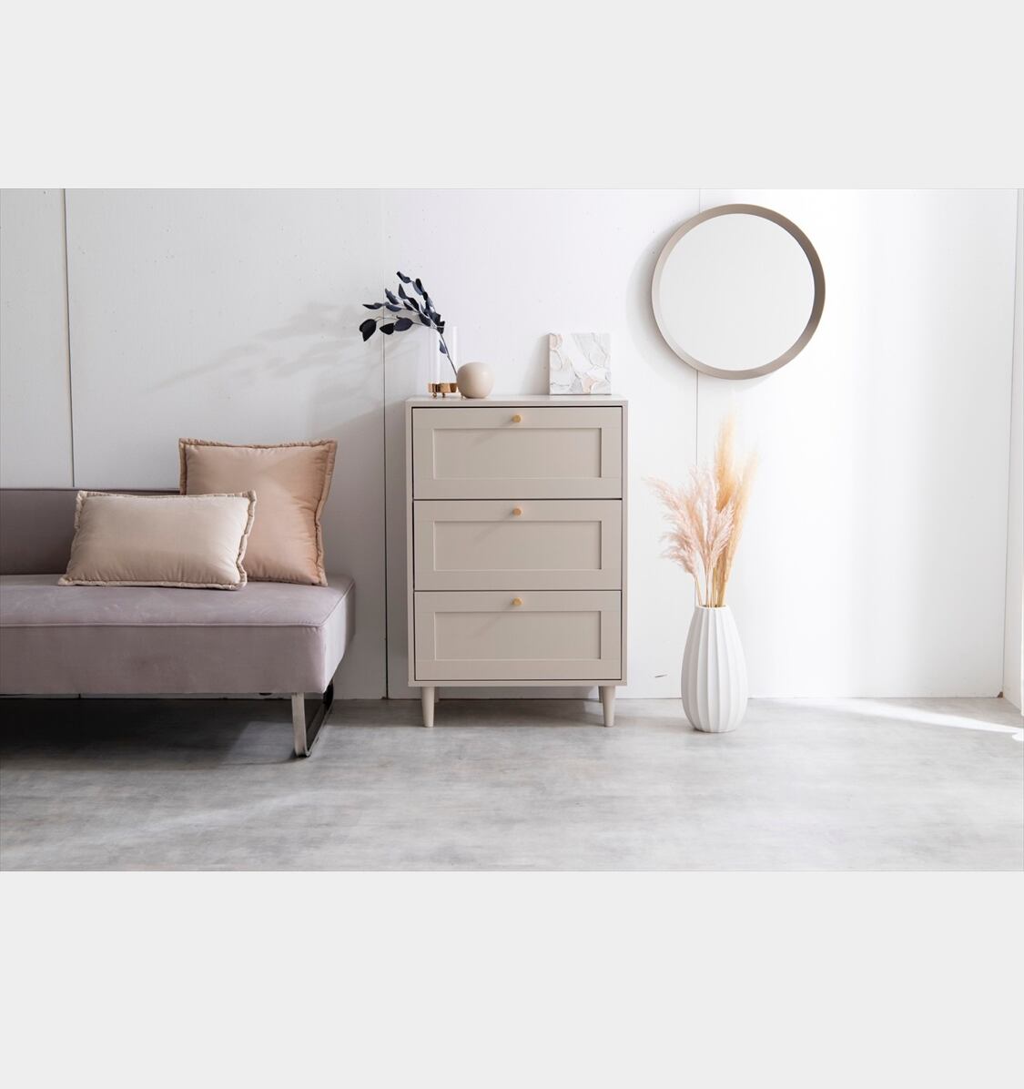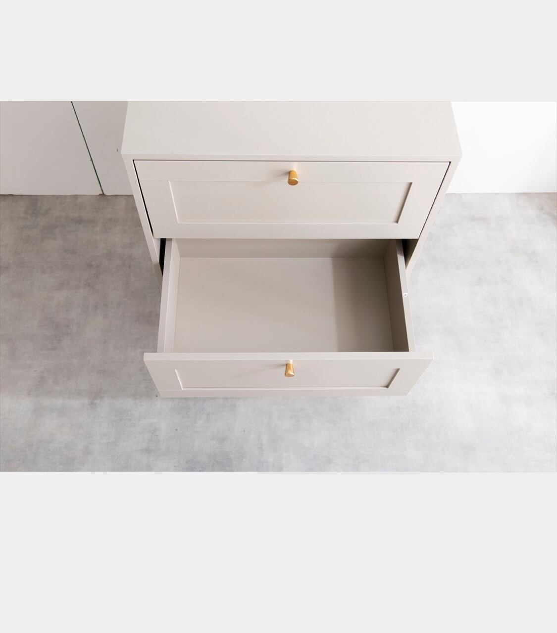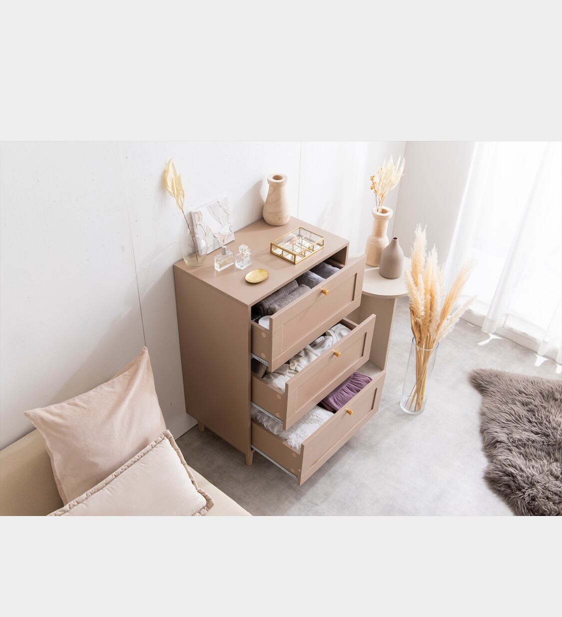 3段の引き出しは収納スペースがたっぷりで、小物や衣類などを整理するのに便利です。