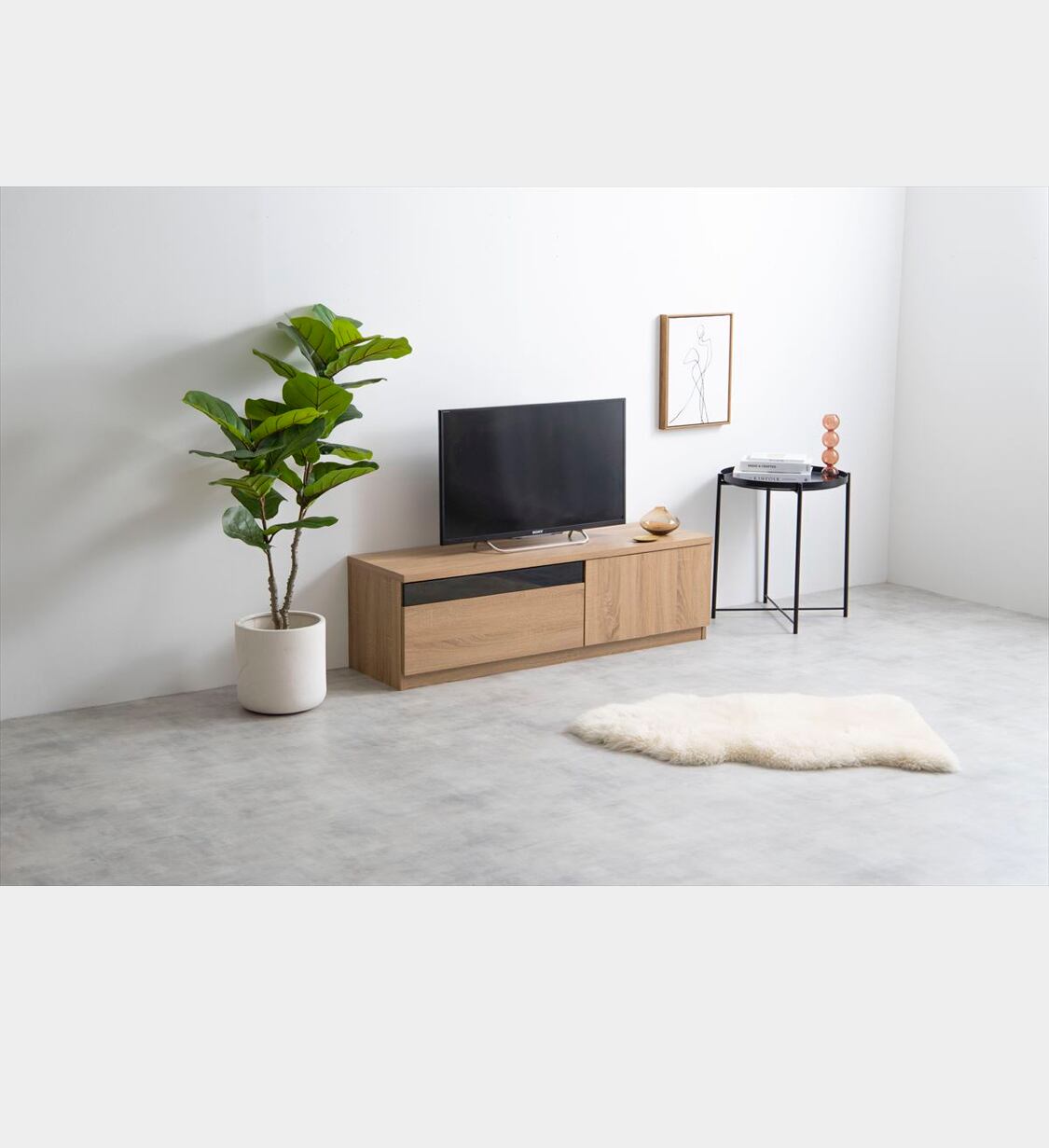 デザイン性の高いブラックパネルが付いた幅広のテレビ台。コンパクトながらも収納力抜群。