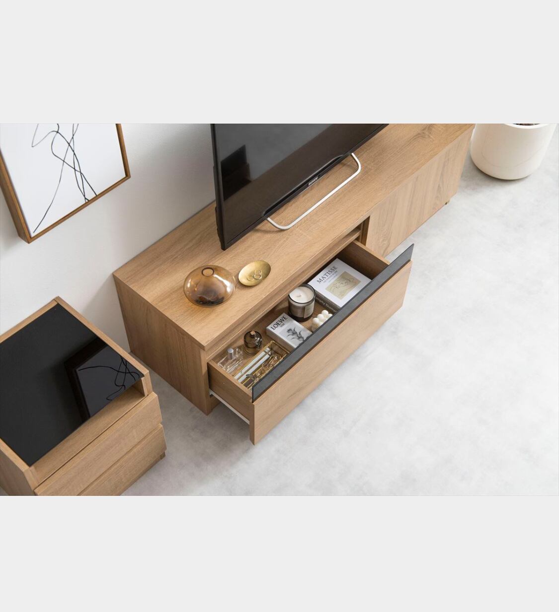 テレビを置くだけでなく、リビングのインテリアにも一役買うConnie ブラックパネル付きテレビ台。幅120cmとコンパクトなサイズながら、たっぷりの収納スペースを確保しています。