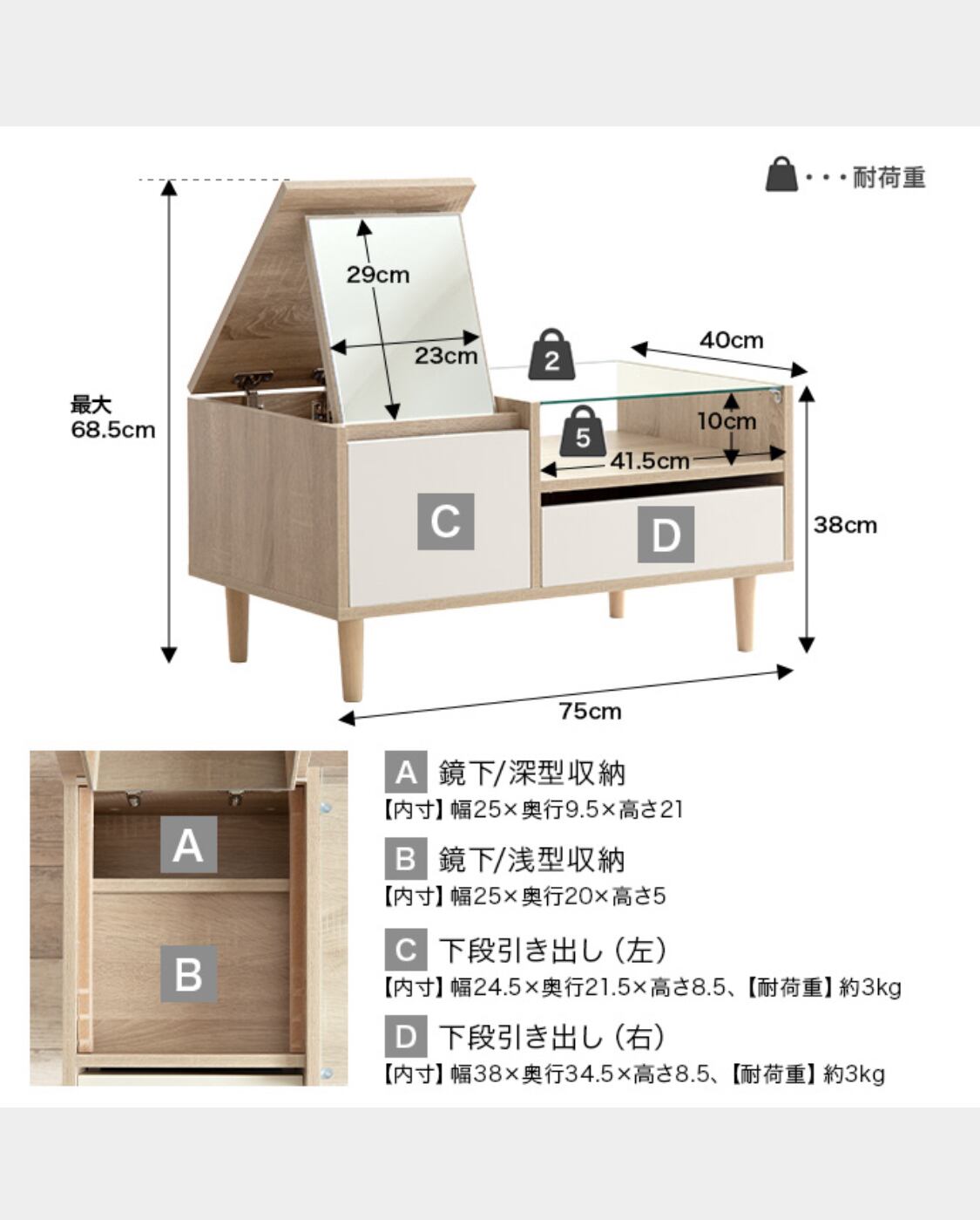 【耐荷重】天板:約5kg 、