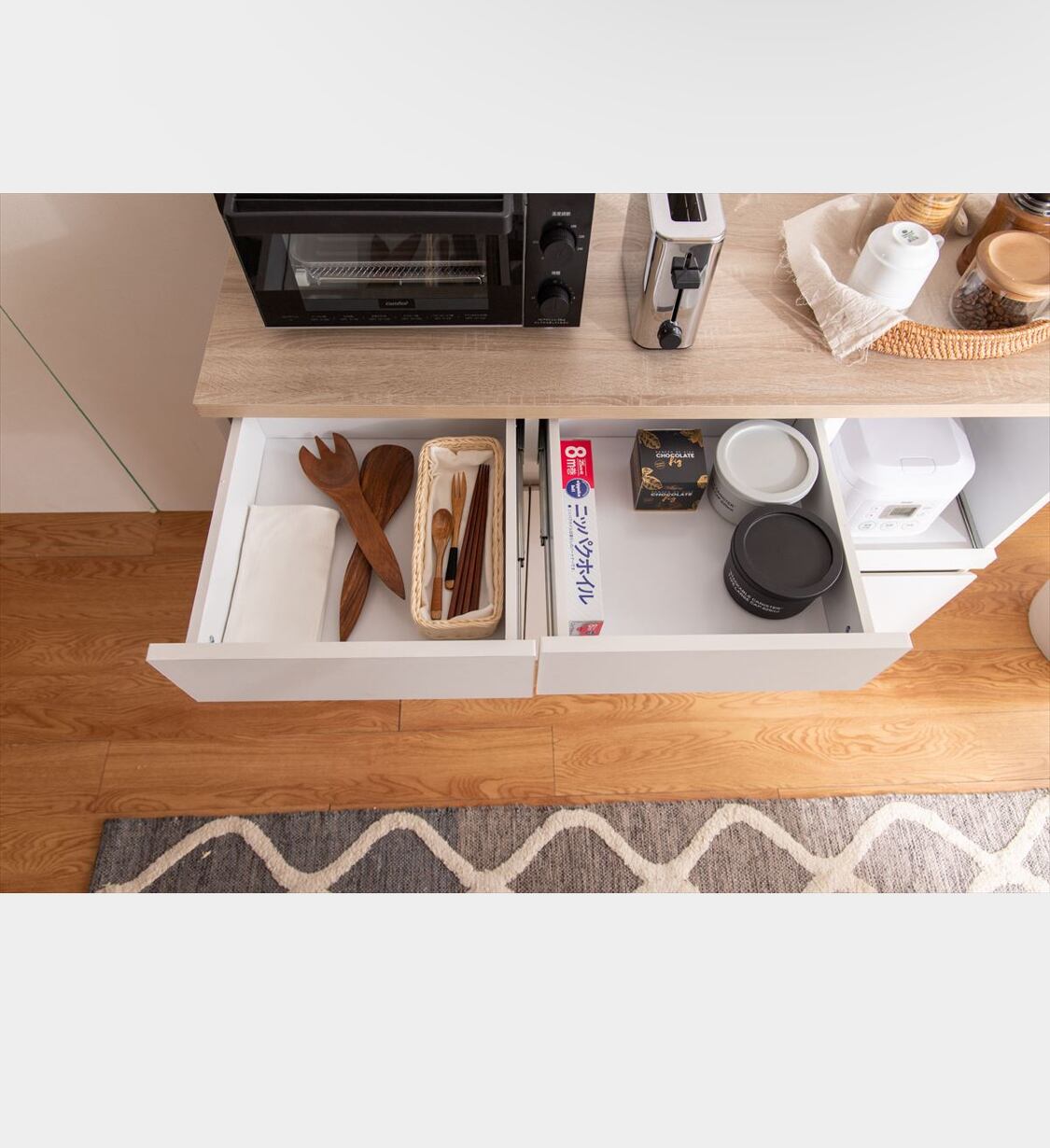 引出しや収納スペースも充実しており、キッチン周りの整理整頓もスムーズに行えます。 このカウンターは、使い勝手だけでなくデザインにもこだわりました。