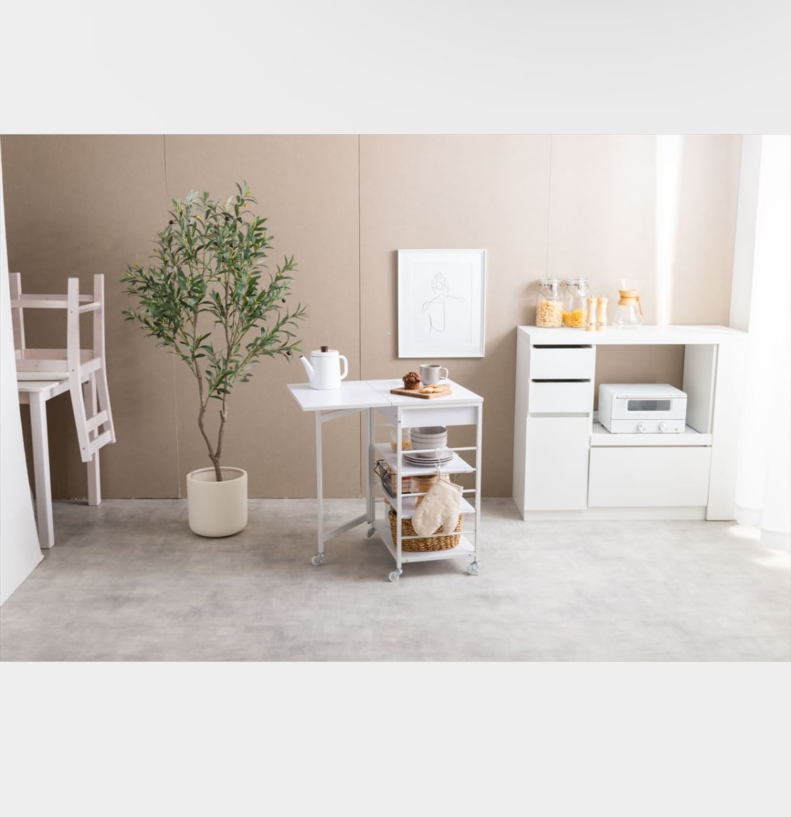 コンパクトなサイズから広げることができるので、キッチンやリビングの狭いスペースにもぴったり。食器や調理器具、食材などを収納しておけるので、スムーズに料理ができます。