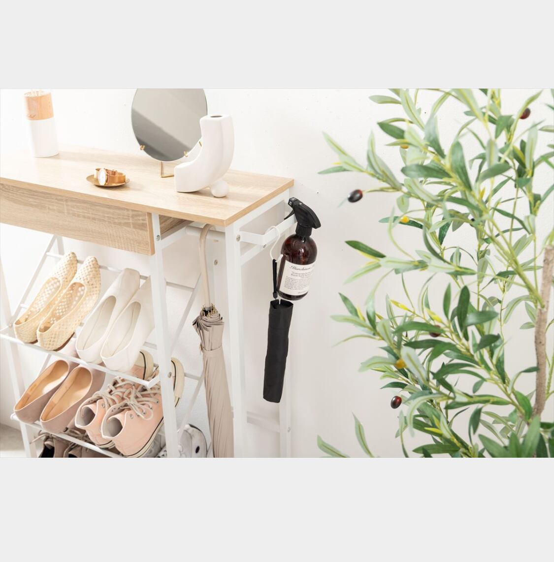 上部には傘立て、下部には引き出しと棚板が付いており、使い勝手の良さが魅力です。傘立ての上には、小物入れとしても利用できるスペースがあります。